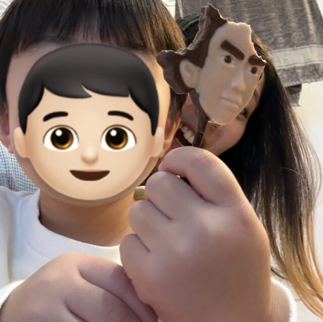 ↑ お土産で持ってきた「坂本龍馬チョコ」を食べる甥っ子。笑