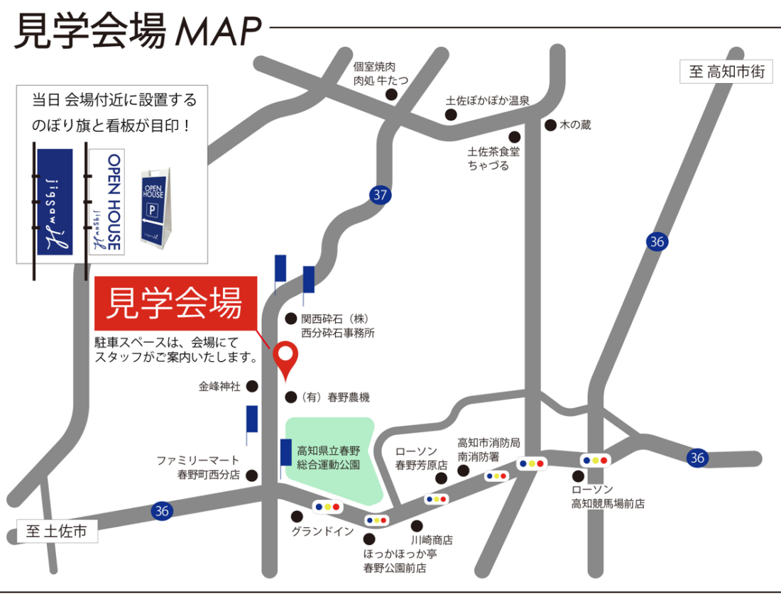 青いのぼり旗と看板を目印に、直接現地までお越しください。